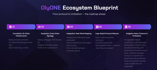 Oly One’s mission is to build an on-chain institutional fabric composed of standardized rule sets and interoperable contracts. The protocol emphasizes four core pillars: