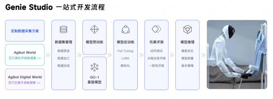 Furthermore, AgiBot has developed Genie Studio specifically for embodied intelligence scenarios, serving as a one-stop development platform that provides developers and partners with a full-stack solution. The platform offers comprehensive support throughout the entire process, from data collection and management to model training and fine-tuning, as well as simulation evaluation. The out-of-the-box GO-1 base model integrates a Video Training solution and a unified training framework, featuring a complete built-in development toolchain that enables one-click compilation and deployment on real robots, effectively enhancing development efficiency and accelerating the implementation and application of embodied intelligence technology.